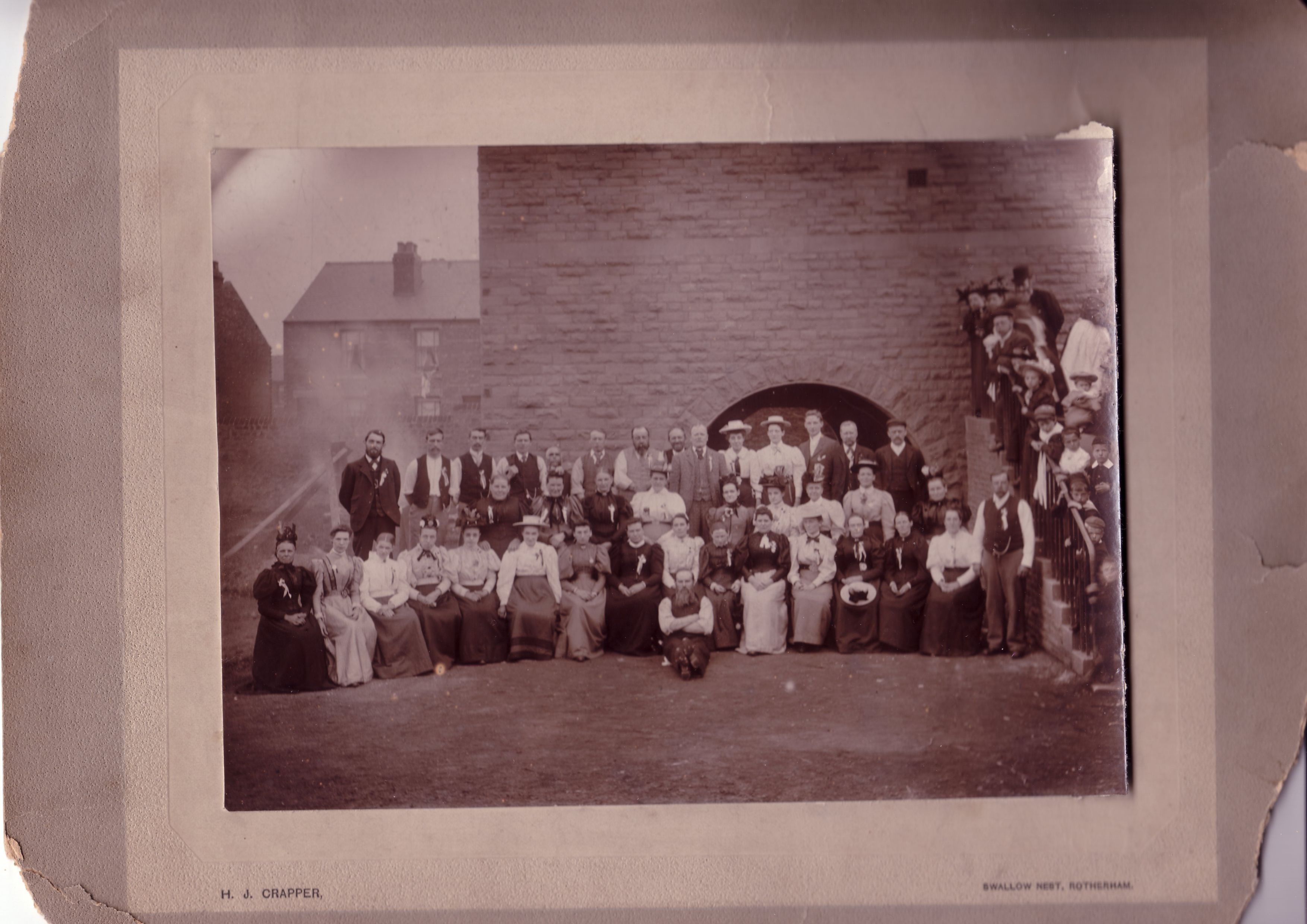 This picture is belived to have been taken in Swallownest, South Yorkshire, and may be linked to the Hodgkins family, but otherwise the building is unidentified and none of the people in the picture are yet identified. Was this taken in Swallownest? Do you know the building? Do you know anyone in the picture?