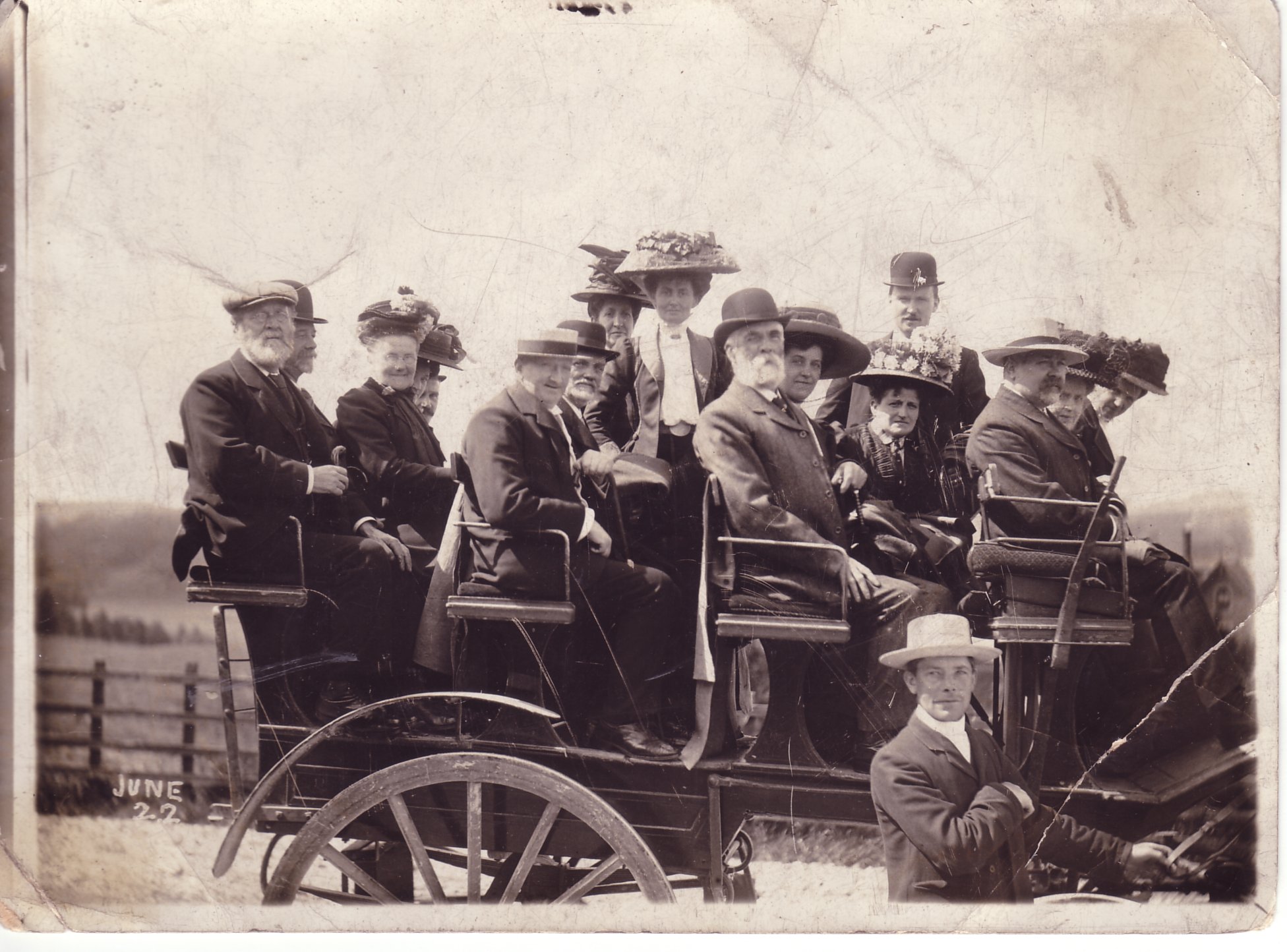 Nothing is known about this picture of some people on a cart or wagon. I suspect the man in the bottom right of the picture (holding the horses' reins) is possibly a brother or brother-in-law of Harry Hodgkins, but this is unproven. Where was this taken? Can you identify the man holding the reins in the bottom right? Do you know anyone else in the picture?